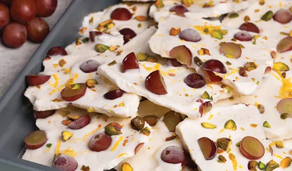 4. Place the baking sheet in the freezer for at least 4 hours or until the yogurt sets. Gently break the yogurt bark into 24 pieces. Store in a re-sealable container in the freezer for up to 2 weeks.